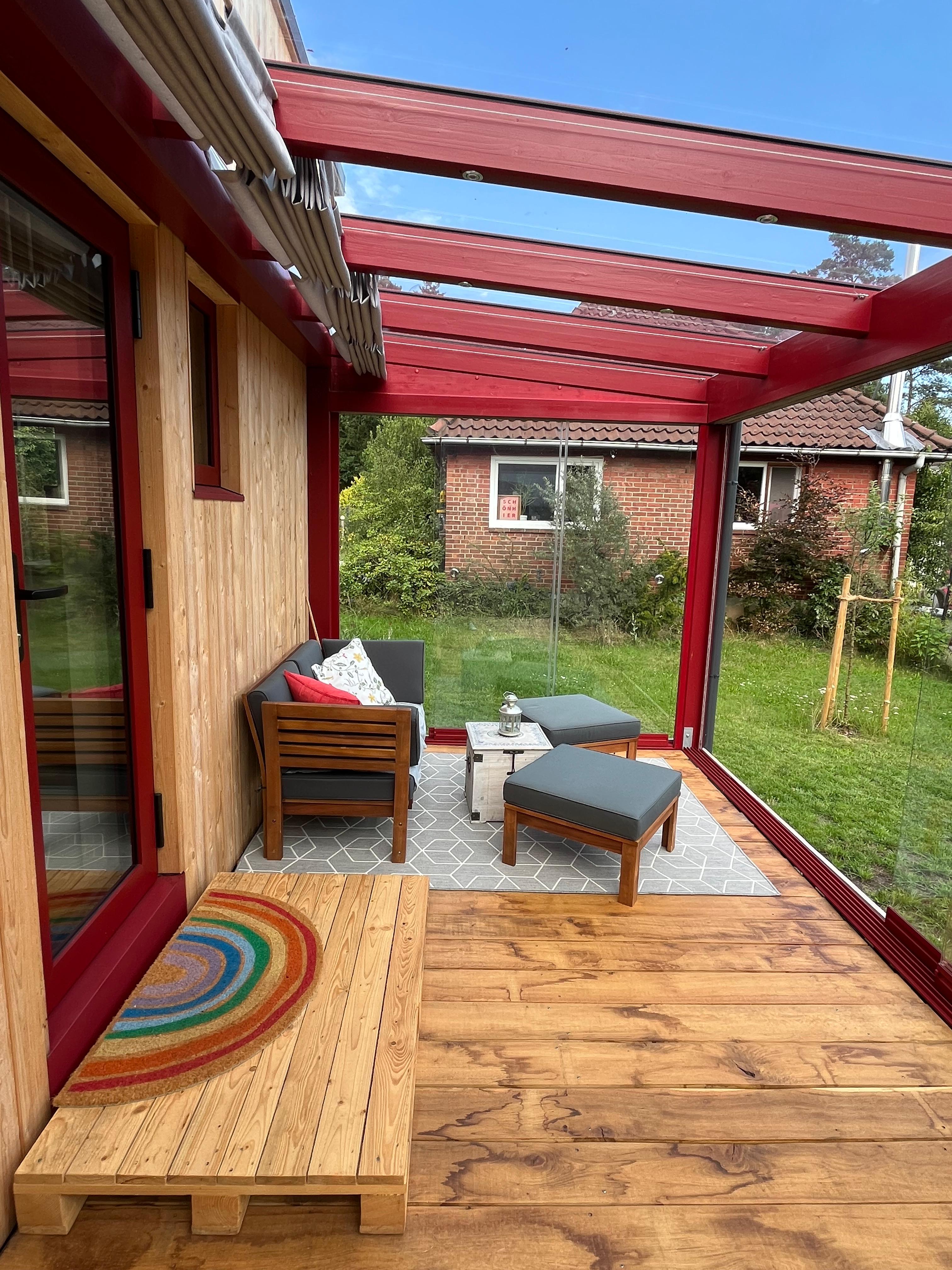 Genieße den lichtdurchfluteten Wintergarten mit Blick in den Garten. Mit Lounge-Ecke und kleinem Gartenofen wird er schnell zum Lieblingsplatz.