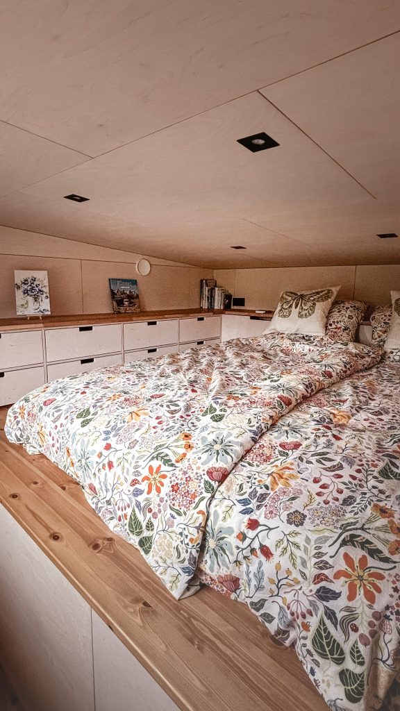 Das kuschelige Bett hat eine Länge von 2,20m, die Dusche kann man bequem zu zweit nutzen, Einbauküche mit Espresso Kocher, Mikrowelle und großer Kühl-Gefrier Kombination – alles da!
